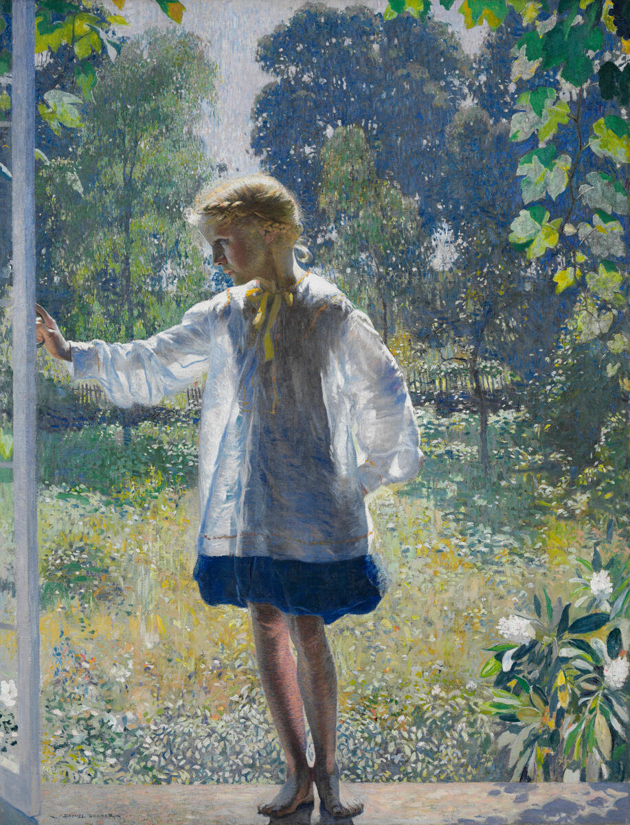 A father’s love radiates from this iridescent painting of sunlight and youth. Shaped by the realist tradition of Thomas Eakins at the Pennsylvania Academy of the Fine Arts, Daniel Garber adopted Impressionist color and handling during a two-year sojourn in Europe. Returning in 1907, he settled into a farm along Cuttalossa Creek in Bucks County, Pennsylvania, where he harmoniously merged nature, art, and domestic life. In this portrait of his daughter, Tanis, light from the garden outside his studio renders her smock translucent, while the composition’s serene geometry captures the shimmer of an endless summer afternoon.